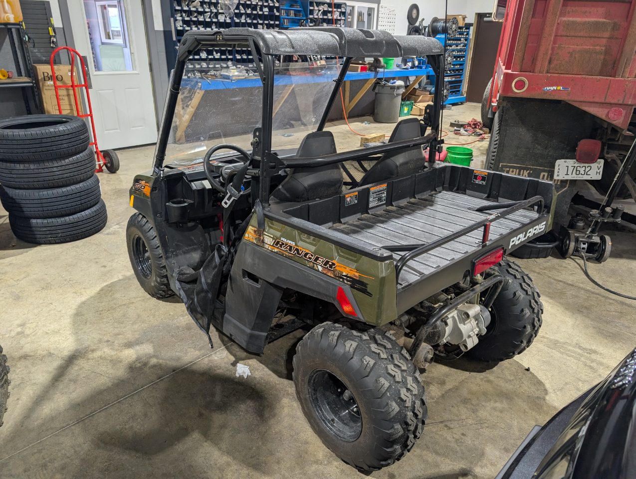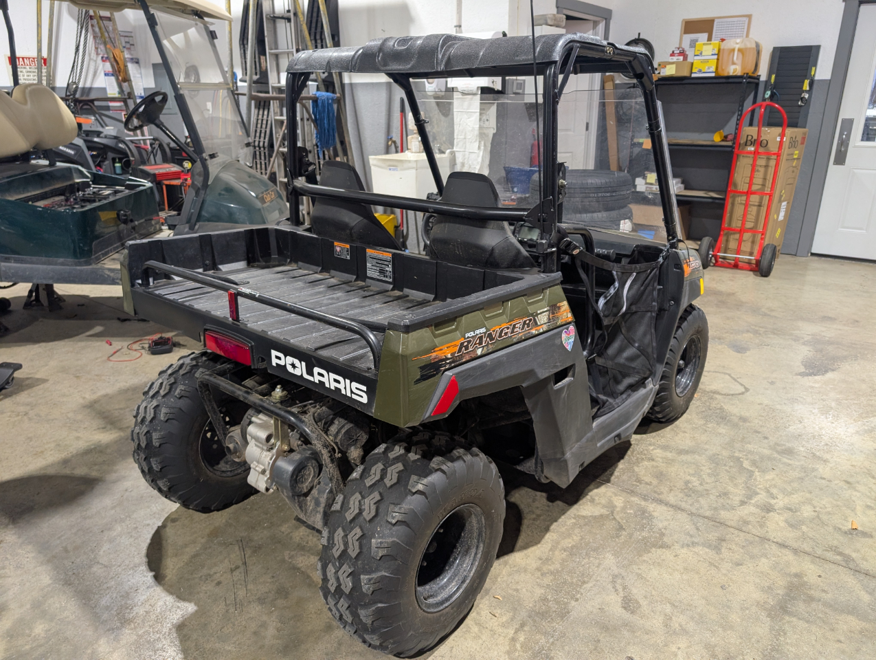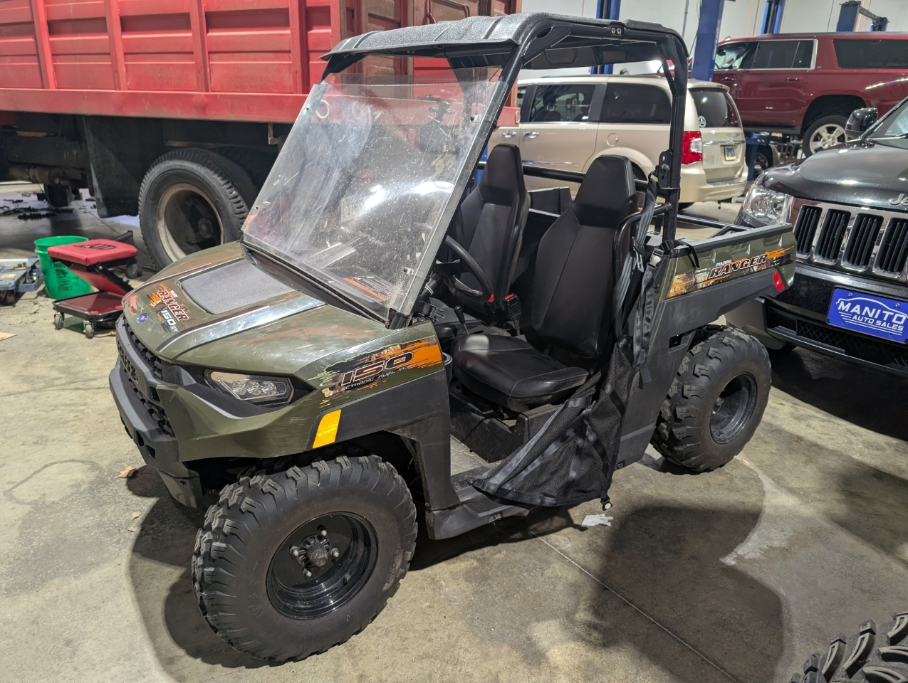 The 2021 Polaris RANGER 150 EFI is a youth-oriented, side-by-side UTV designed for riders aged 10 and up, featuring a 150cc engine and advanced safety technologies like geofencing, digital speed limiting, and passcode-protected safe start. It is built for safe and controlled fun with an adjustable seat and steering wheel to accommodate a growing rider, and includes a 50 lb capacity bed box and 8 inches of ground clearance. Key specifications include electronic fuel injection, a 2WD automatic PVT transmission, and 4-wheel hydraulic disc brakes.