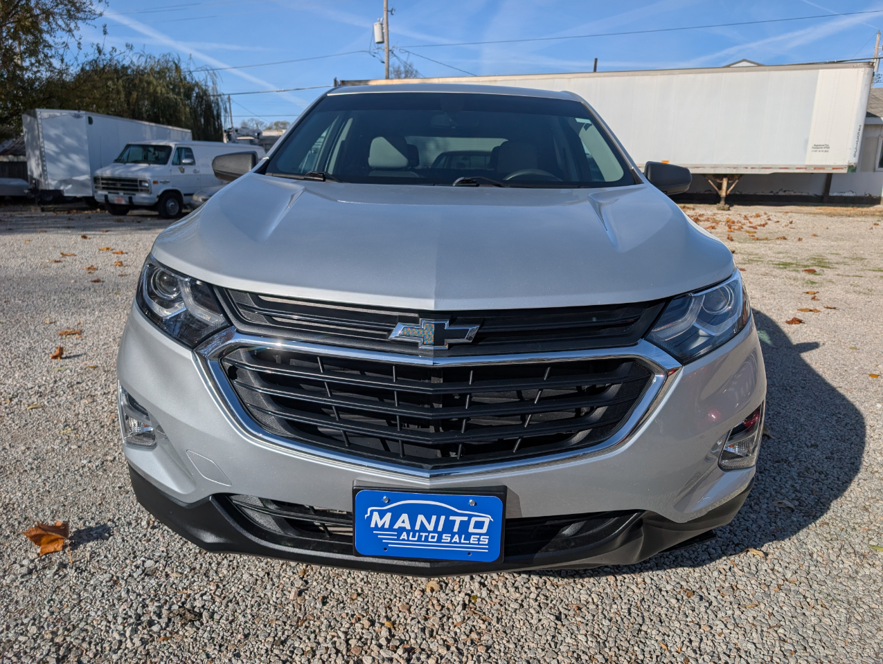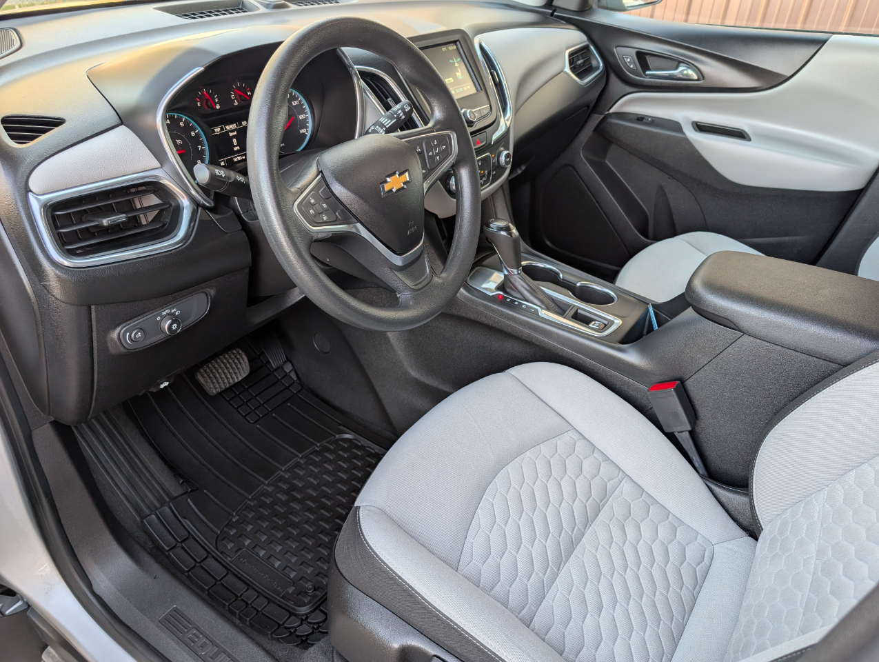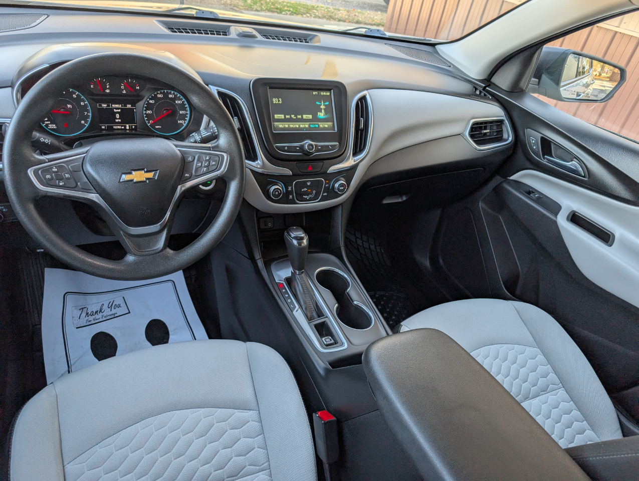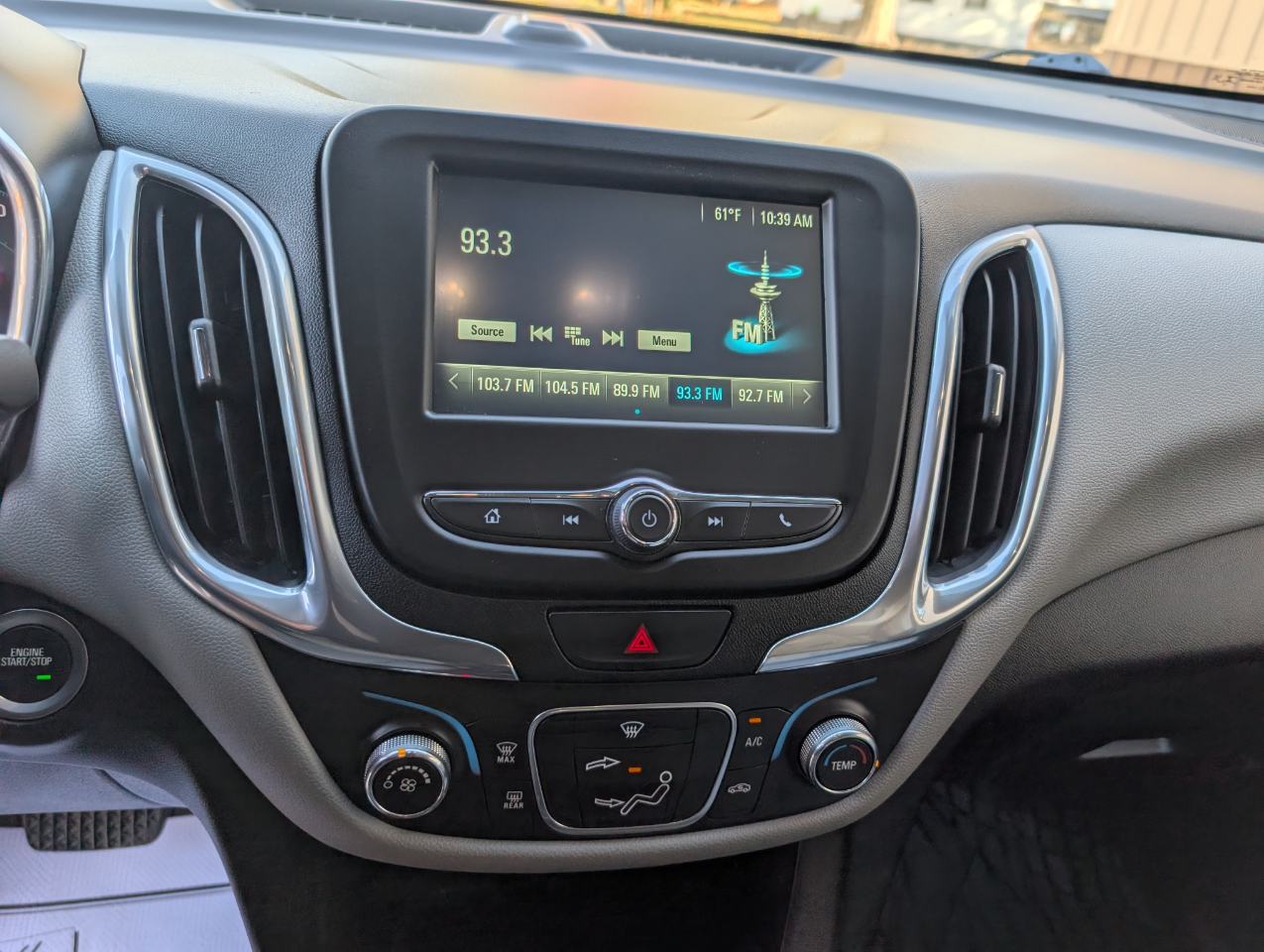 The 2018 Chevrolet Equinox LS is a compact SUV with a standard 1.5L turbocharged engine, six-speed automatic transmission, and front-wheel drive. Key features include a Chevrolet MyLink infotainment system with a 7-inch color touchscreen, Bluetooth, and Apple CarPlay/Android Auto compatibility. It offers seating for five, a backup camera, and a split-folding rear seat for cargo versatility.